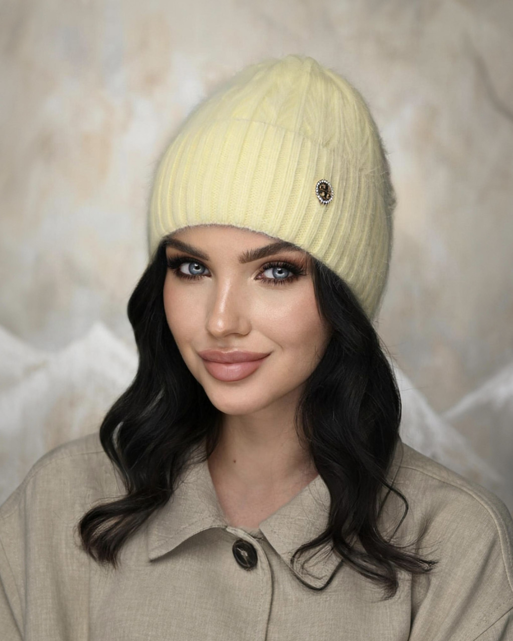Ця жіноча шапка виготовлена з м'якої та теплої пряжі Ангора, що робить її незамінною для холодної погоди. Всередині — повний підклад із флісу, що забезпечує додаткове утеплення й комфорт. Унікальне в'язання надає шапці вишуканого та стильного вигляду. Відворот додає додатковий об'єм, а фірмова прикраса завершує образ, підкреслюючи елегантність і індивідуальність виробу. Чудовий вибір для створення стильного зимового образу!